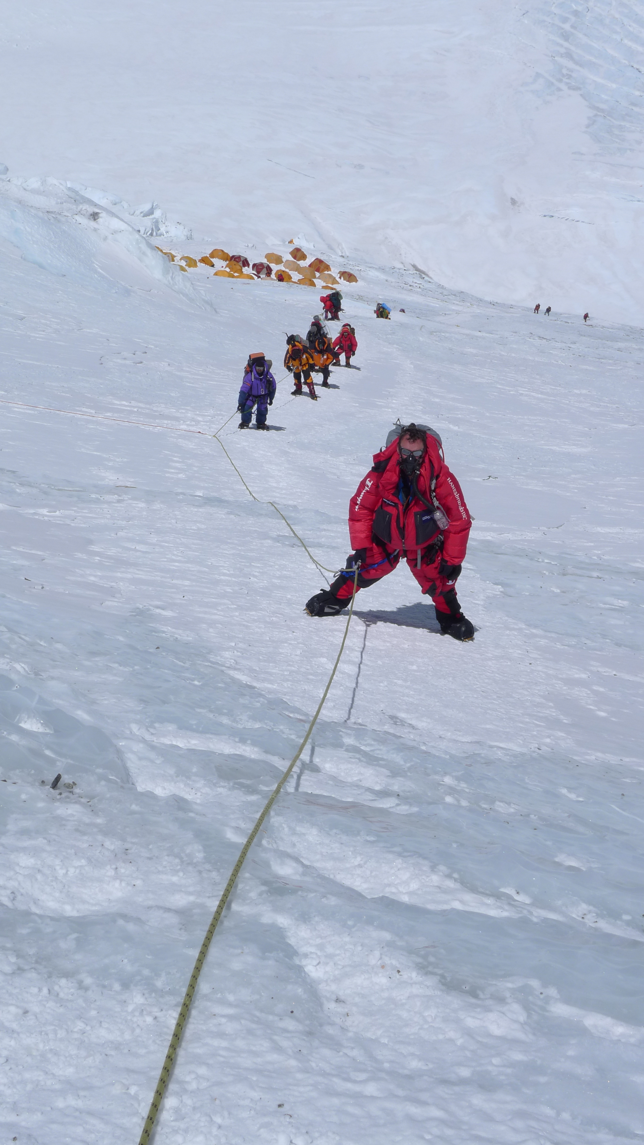 Scott just called from camp 2. They have been there for a couple of nights with their backs pushed up against the sides of the tent against the wind. He sounds great. The foul days of initial acclimatizing are over. The wind is too strong to go and stay at camp 3 up on the Lhotse Face so they are just going to head up and tag camp 3 today. The Lhotse face climbs steeply out of the Western Cwm (“coom”) up to the South Col and camp 4 – the final camp. Camp 3 is part way up the face. It’s over 7000m so is an essential part of the acclimatization schedule. After camp 3 on the actual summit bid, they will start using oxygen.